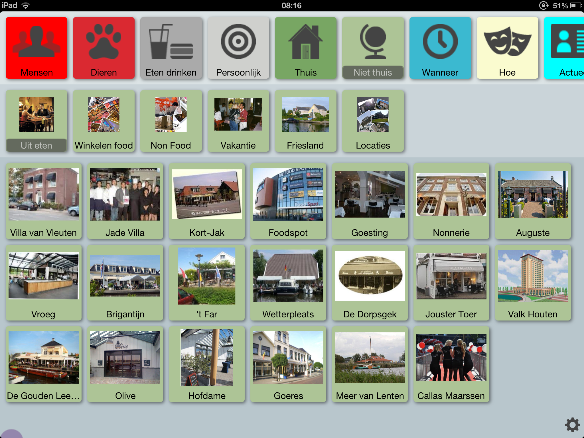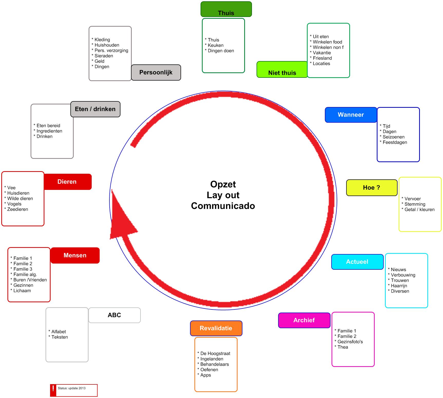Zoals bekend gebruiken wij al geruime tijd de app Communicado om sneller met elkaar te kunnen vaststellen waar we over gaan “praten”. Of om soms het startpunt te kunnen bepalen waar Thea het in haar hoofd over heeft. Belangrijk daarbij is dat de app qua inhoud onze behoefte afdekt. Hoewel de inhoud van de app zeker niet statisch is en a.h.w. meegroeit met de communicatiebehoeften, heb ik mijzelf wel in 1e instantie gedwongen even goed na te denken over welke content er in ons geval er in de app moest worden opgenomen. Het kan dus voor andere gebruikers verschillen,maar ik denk dat een behoorlijk gedeelte van de inhoud ook voor anderen zinvol is bij het gebruik. het is om die reden dat ik het schema hieronder weergeef. Op verzoek (email) is uiteraard een image verkrijgbaar.
